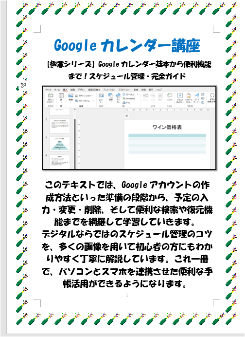 新たなスケジュール管理のスタイルを提案する「【極意シリーズ】Googleカレンダー基本から便利機能まで!スケジュール管理・完全ガイド」は、Googleカレンダーを活用して、効率的に時間を管理するための実践的な教材です。このガイドでは、基本的な使い方から、便利な機能の活用法までを丁寧に解説しており、どなたでも安心して学ぶことができる内容となっています。段階的な学習により、スケジュール管理をスタイリッシュに行うためのスキルを身につけることができます!