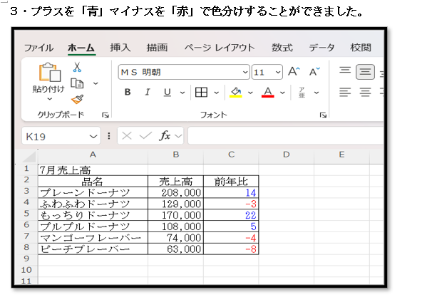 プラスを青、マイナスを赤で表示